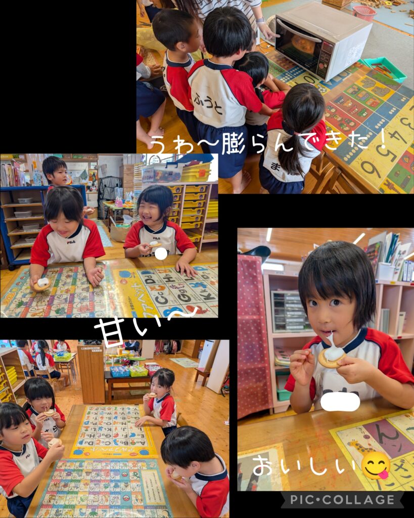 マシュマロを試食したり、レンジで膨らむ様子を見たり、楽しくて美味しい時間を過ごせました✨