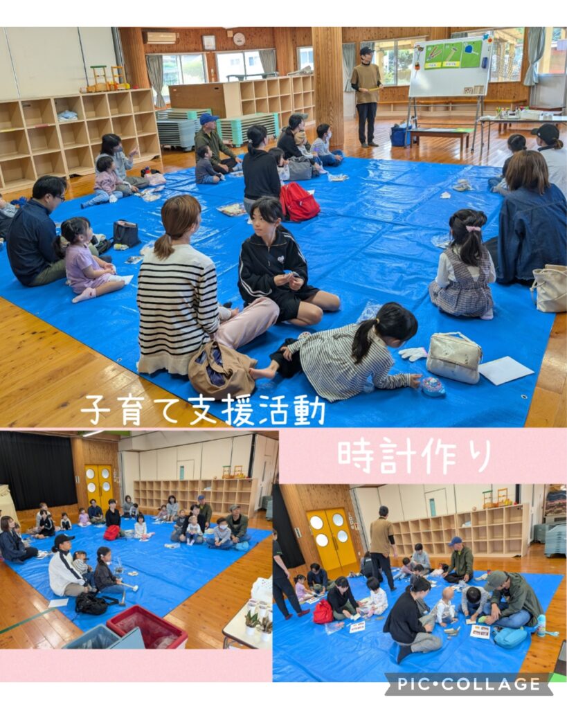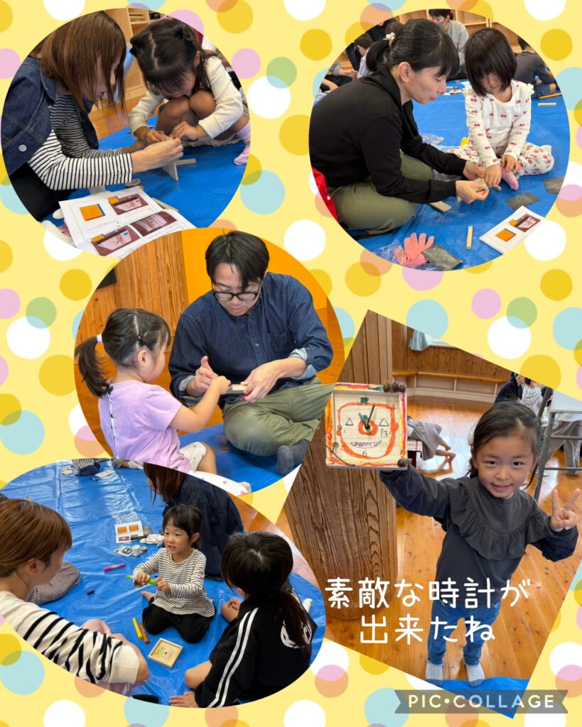 10月25日~今年度2回目の子育て支援活動がありました 2025.11.01 今回は木工教室で時計作りをしました! 教えて下さったのは職員の旦那様(*^-^*) ヤスリをかけたり金槌を使ったり、普段しないことを親子で楽しく体験!(^^)! 好きな絵を描いたり、ドングリなどをグルーガンで付けたりしている親子もいましたよ。 個性あふれる可愛い時計ができあがりました(*^^)v 9家庭の参加がありました 親子で楽しく活動できました