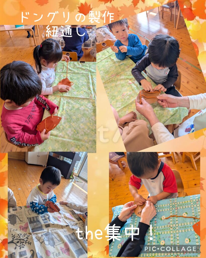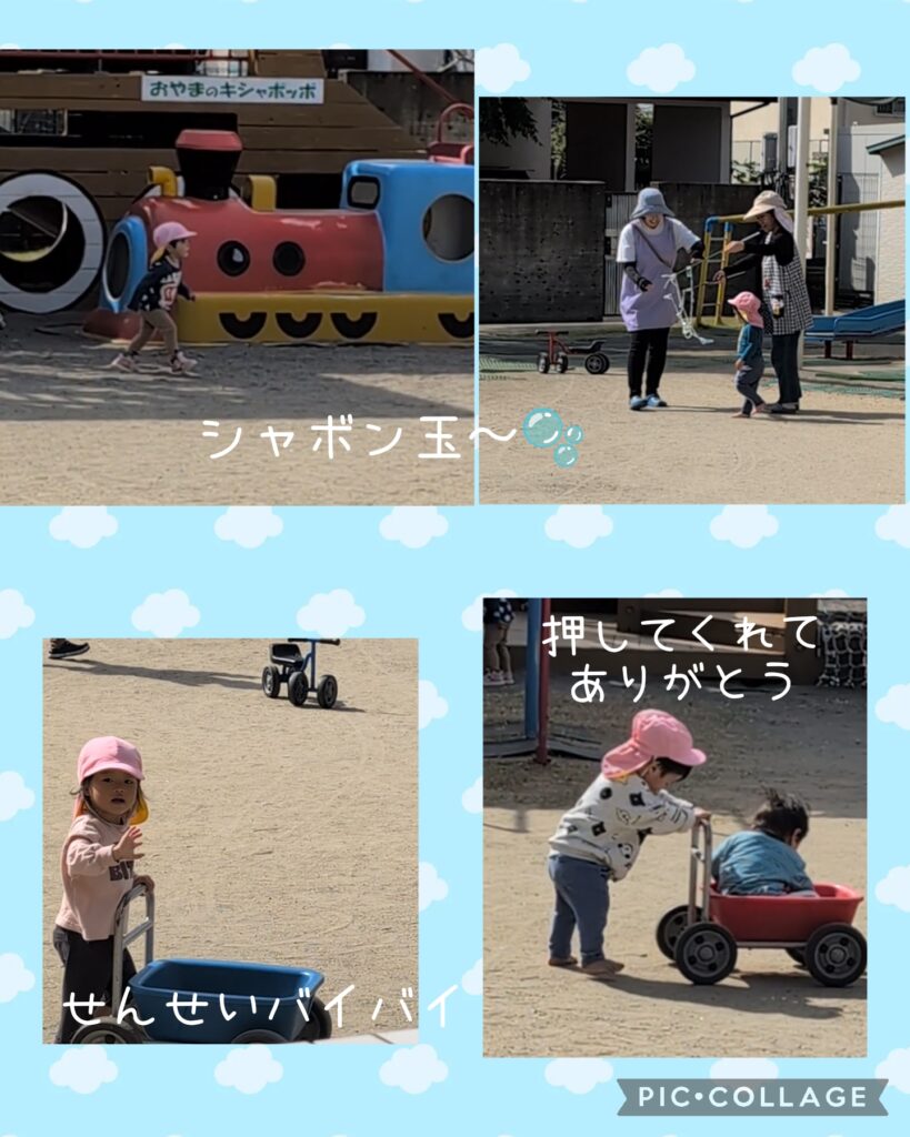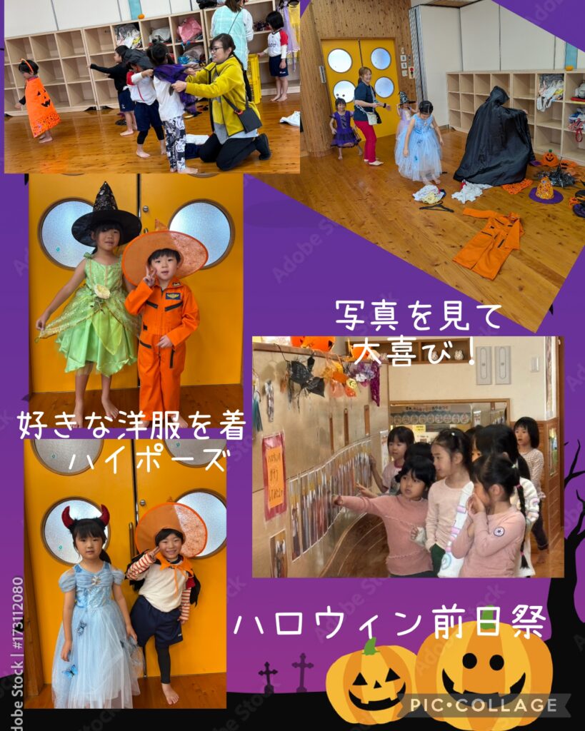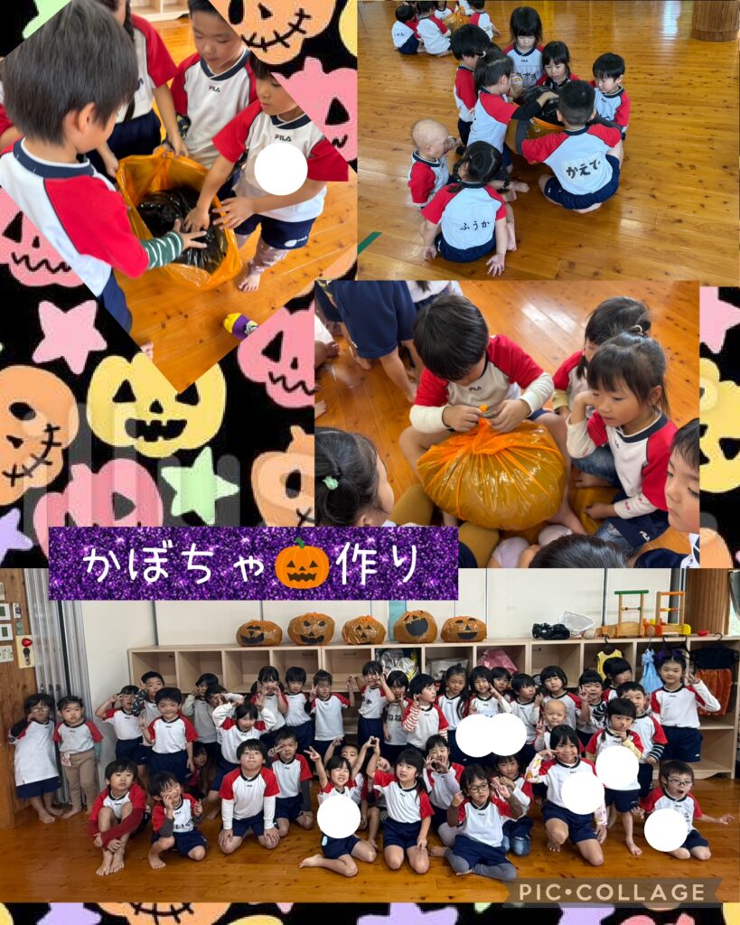 朝晩は冷えますが、日中はポカポカ暖かい日も多いですね 2025.11.01 そんな日は0.1歳児は沢山外遊び! シャボン玉にも喜ぶ姿がありました。 2歳児はどんぐり製作で紐通し。 穴を見ながら集中して取り組んでいましたよ。 幼児クラスは新聞紙遊びやハロウィン全日祭! 子ども達が弾けていました(笑) 子ども達がやりたいことや考えたことは笑顔が沢山💖 ハロウィンも楽しみです✨ 弾けて遊んでいました 着てみたい洋服を着ました 飾るためのカボチャはグループで製作 やればできる! 暖かいとたくさん戸外で遊べて楽しいね~