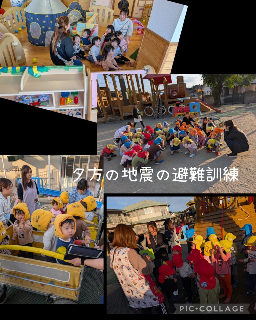11月7日~夕方の時間に地震の避難訓練をしました。 2025.11.15 子ども達には知らせず夕方16時20分 すでに降園している子やお迎えが来る時間帯。 2歳児以上は園庭で遊んでいましたが、ベルが鳴ったら殆どの子どもが動きを止めて黙りました。 しっかり放送や職員の指示を聞いて避難出来ました。 毎回何かしら課題が出てきます! その課題を共有することで本当に何かあった時の役に立つと思います。 登降園タブレットやスマホを使って残っている子の人数を把握して確認