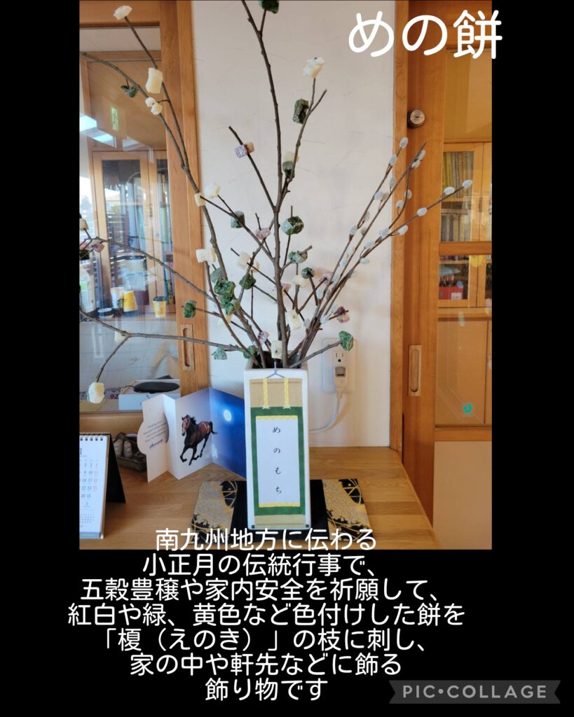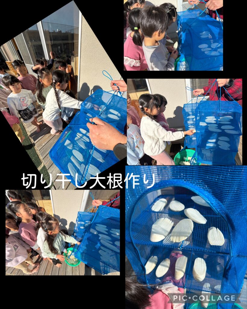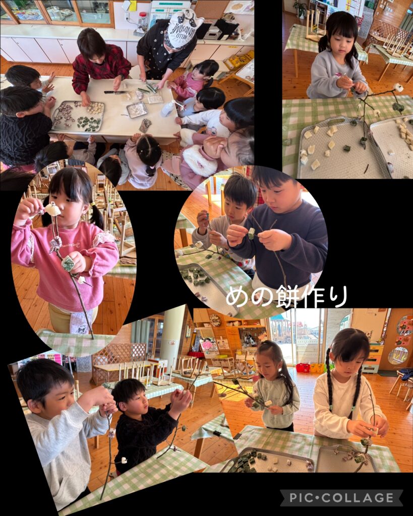 1月8日~年長児が『めの餅作り』をしました。 2026.01.16 南九州地方に伝わる伝統行事で、五穀豊穣や家内安全を祈願して、紅白や緑、黄色などに色付けした餅を「榎(えのき)」の枝に刺し、家の中や軒先などに飾る飾り物です。 これできっと今年も安全に楽しく過ごせると思います。 切り干し大根つくりもしました! グッと冷え込んでくれたら美味しい切り干し大根になると思います。 完成したら給食の食材として登場しますよ。 1人一本ずつ色のついた餅を枝に刺していきました。 みんないい感じに出来ました 保育園の玄関にも飾りました 干し物ネットを購入したので作業が簡単