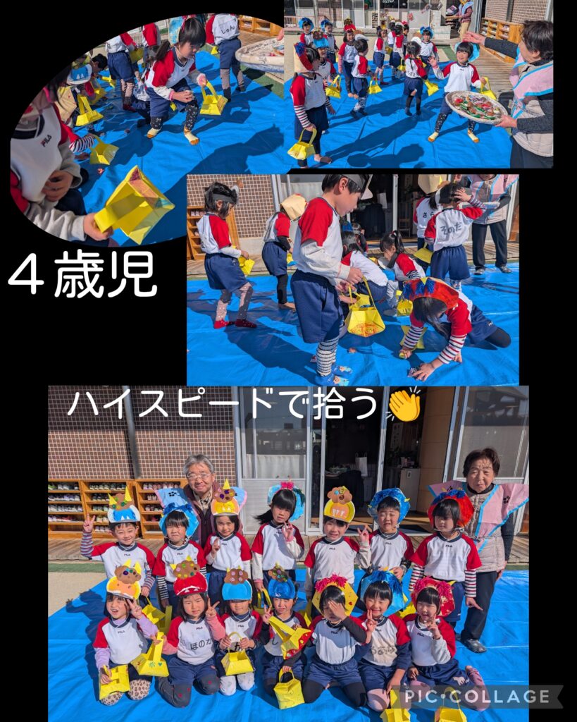 もし来たらやっつけよう、と準備していた紙を丸めた豆を勇敢に投げる子、大泣きする子、泣きながらも豆を投げる子、みんな鬼退治を頑張りました(≧▽≦)
