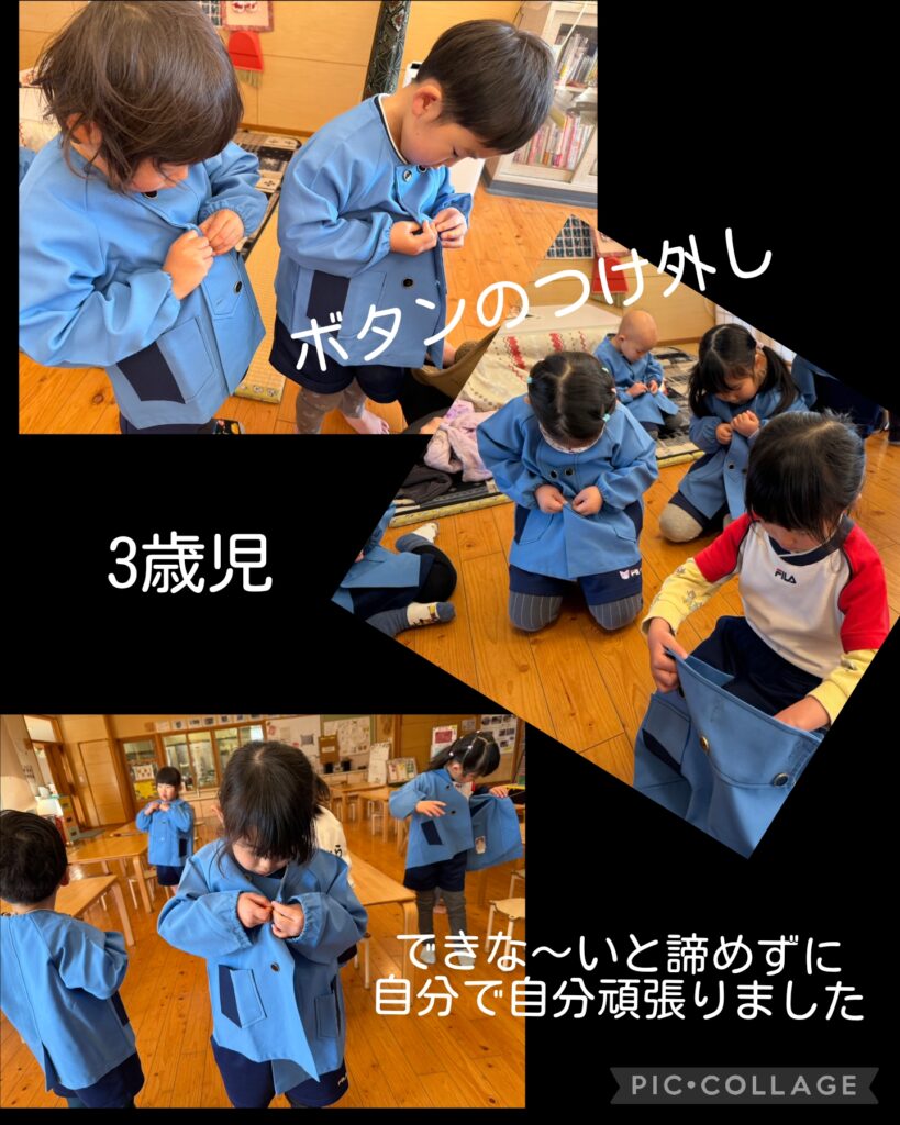 終了記念写真撮影のために制服着用!「せんせいできない」とすぐやってもらおうとする子ども達。しっかりとやり方を伝えるとみんな必死で頑張って、ボタンのつけ外しが出来ました。普段なかなかボタンのつけ外しの機会が無いよね"(-""-)"