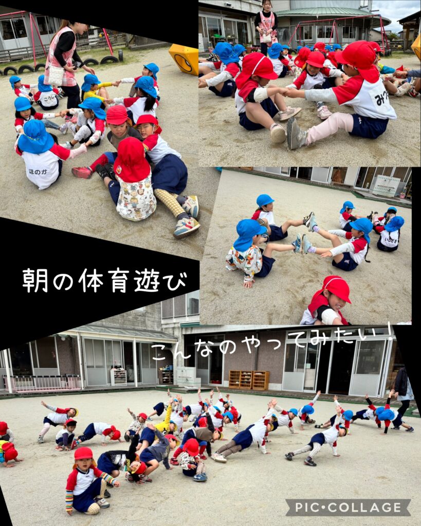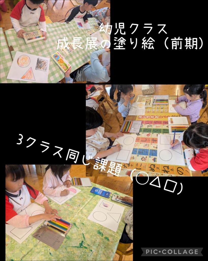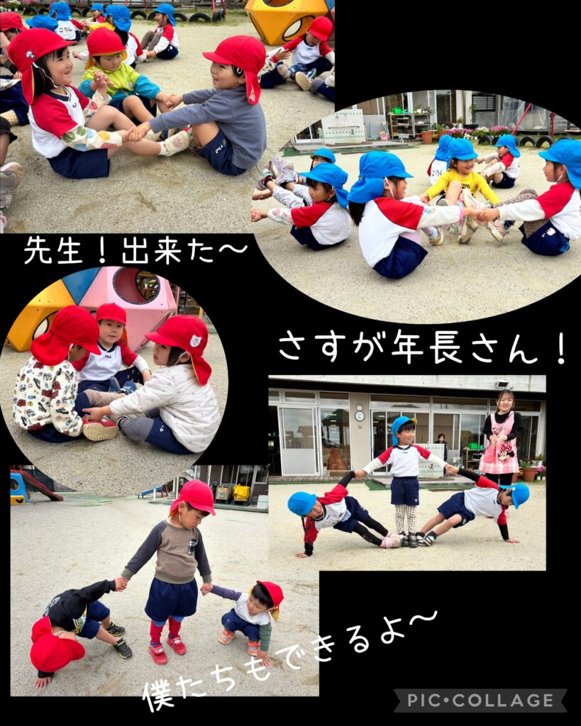 4月10日~幼児クラスの朝の様子 2026.04.17 幼児クラスでは朝の遊びの後に、体育遊びやゲームをしています。 先日はバランス遊びから、こんなのもできるよ!と、お友達と組体操をしました。 みんな楽しそうにペアを作って挑戦していましたよ(^_-)-☆ 3歳児さんもやる気満々でした👏 成長展の塗り絵も各クラスで取り組みました。 色々な面での成長が楽しみです✨ 組体操好きな子ども達‼ 出来たら嬉しいね~ 前期と後期でどのくらい変化があるか楽しみ 2歳児さんの朝の会の様子